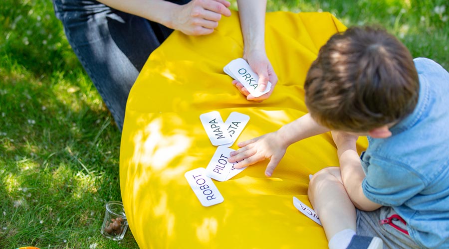 Un nen amb les targetes del mètode doman