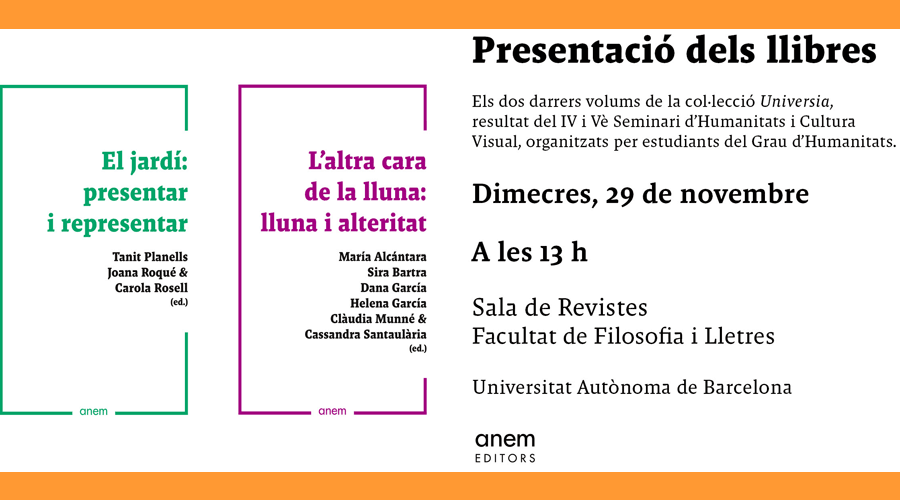 L’editorial pirinenca nascuda a Andorra, Anem Editors presenta aquest dimecres, 29 de novembre, a les 13 hores i a la sala de Revistes de la Facultat de Filosofia i Lletres de la Universitat Autònoma de Barcelona, els dos darrers volums de la col·lecció Universia, que són el resultat del IV i Vè Seminari d’Humanitats i Cultura Visual, organitzats per estudiants del Grau d’Humanitats.