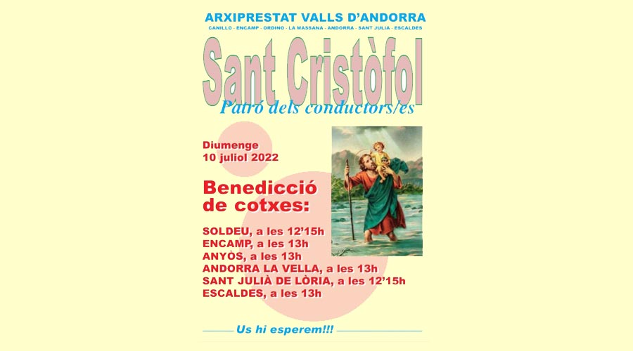 Aquest diumenge, 10 de juliol, se celebrarà al Principat d’Andorra la tradicional benedicció de vehicles coincidint, aquest mateix dia, amb la festivitat del patró dels conductors, Sant Cristòfol. La benedicció es durà a terme en sis punts diferents de la geografia andorrana.
