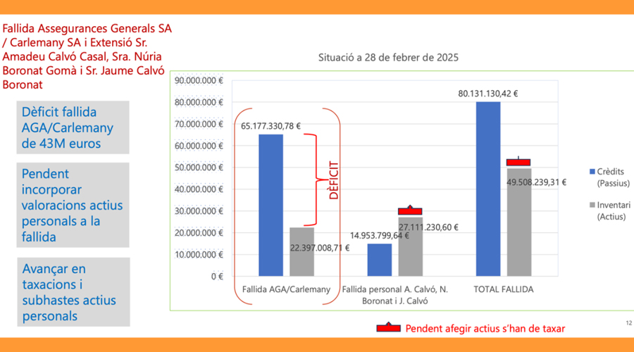 El passiu total de la fallida, que es correspon amb els crèdits declarats i acceptats, ascendeix a més de 80 milions d’euros, mentre que per altra part -pel que fa als actius disponibles, incloent-hi propietats, inversions financeres i comptes bancaris- hi ha una valoració provisional que podria ascendir fins a uns 49 milions d’euros, en funció dels resultats de les subhastes i vendes que s’haurien de realitzar, situació que tot plegat deriva en un dèficit important per a liquidar els crèdits.