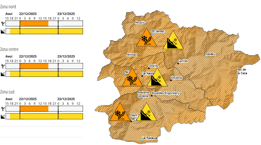 El Servei Meteorològic també indica en l’actualització del butlletí d’allaus que Andorra se situa en el nivell 3 de perill d’allaus amb possibilitats de desencadenament molt fàcil en alguns casos i vessants i assolir puntualment grans dimensions. En aquest sentit, es recomana prudència a l’hora de realitzar activitats a la muntanya i, en cas de fer-ho, que sigui sota camins marcats i segurs de les estacions d’esquí. Així, també es recomana anar acompanyat, sempre equipat amb material de seguretat i avisar de la sortida i recorregut.