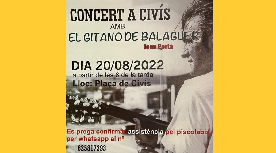 Joan Porta, El Gitano de Balaguer, actuarà aquest dissabte, 20 d’agost, a la plaça Major de Civís. El concert està previst per a les 8 de la tarda i s’hi podrà escoltar les cançons que ha popularitzat el cantautor balaguerí al llarg de la seva carrera musical.