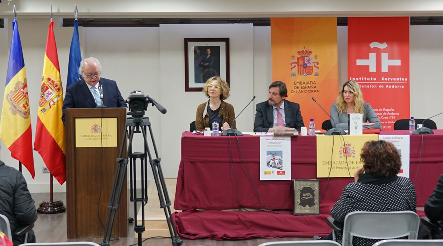 Però, a més a més, no podem oblidar a Miguel de Cervantes (1547 – 1616), que ens va aportar la proposta tradicional de l’Ambaixada Espanyola al Principat d’Andorra, la lectura del Quixot en la seva vuitena edició. Una edició que es va dedicar principalment als alumnes dels diversos centres escolars del país i que va presidir l’ambaixador espanyol a Andorra, Carlos Pérez-Desoy acompanyat del Ministro Consejero Enrique Conde. Assistiren també altres professors de l’àmbit educatiu del Col·legi Espanyol Maria Moliner que, per cert, aquest any han presentat i publicat la 41a edició dels Premis Sant Jordi. Una Excel·lent aportació literària de present i de futur.