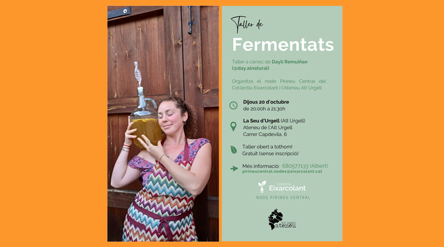 La primera activitat de les que han previst a la Seu és aquest dijous dia 20, a les 8 del vespre a l’Ateneu de l’Alt Urgell, on oferiran un taller gratuït a càrrec de Daylí Remuiñan, que ensenyarà com elaborar fermentats vegetals i begudes fermentades.