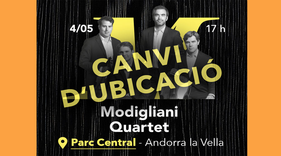 L’actuació de Modigliani Quartet, prevista per aquest diumenge a les 17 hores als Jardins de Ràdio Andorra (Encamp) canvia d’ubicació.