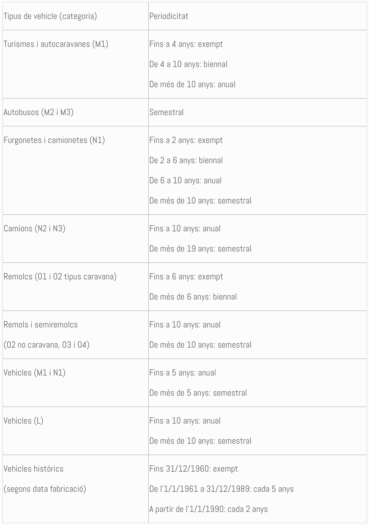 Les noves periodicitats de la ITV, que es computen a partir de la primera matriculació del vehicle, són les següents:
