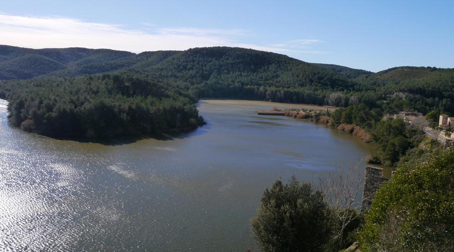 A partir d’aquí connectem amb un itinerari emblemàtic del Parc, el de la font d’Horta, que trobarem a mitja baixada envoltada d’alzines. El sender continua baixant amb bones vistes sobre el pantà, que continuem vorejant, fins que arriba un moment que no hi ha més remei que seguir per la carretera durant aproximadament un quilòmetre, fins arribar altra vegada al poble de Castellet.