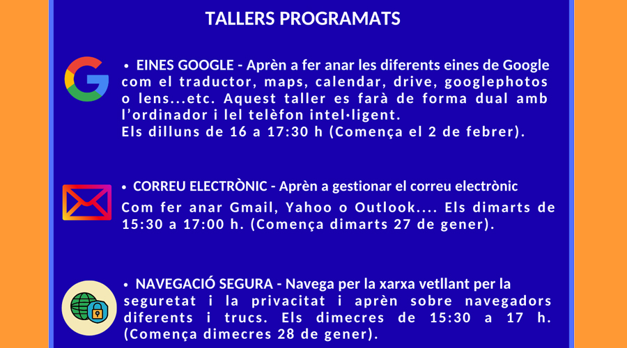 - Eines Google: aprendre a fer anar les diferents eines de Google com el traductors, maps, calendar, drive, googlephotos o lens, etc. Aquest taller es farà de forma dual amb l’ordinador i el telèfon intel·ligent. Els dilluns de 16 a 17.30h (Comença el 2 de febrer).