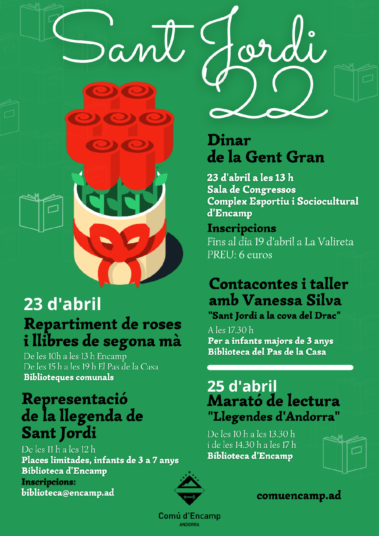 Els actes de Sant Jordi, organitzats per part de la biblioteca comunal d’Encamp consistiran en la representació de la llegenda de Sant Jordi, de les 11 h a les 12 h del matí. Una activitat prevista per a infants de 3 a 7 anys.