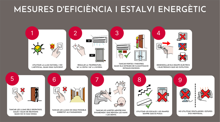 Aquest pla energètic accessible inclou mesures en matèria d’estalvi d’electricitat, com la promoció de la llum natural a les aules, els despatxos i les sales de reunions sempre que sigui possible, apagar els llums en zones de pas i en espais on no hi hagi ningú, potenciar els accessos per les escales de l’edifici i desendollar els aparells elèctrics fora de l’horari laboral.