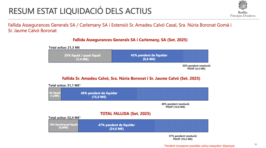 Segons les dades presentades, Assegurances Generals i Carlemany disposen d’actius per valor de 21,3 milions d’euros, dels quals una part ja s’ha fet líquida (un 35%) mentre que la resta està subjecta a processos de liquidació o està condicionada per resolucions judicials.