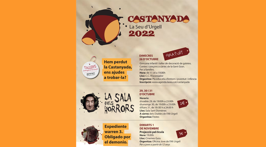 L’activitat, que està organitzada pel Pla Educatiu d’Entorn, i les àrees de Joventut i Infància de l’Ajuntament urgellenc, es realitzarà al centre cívic l’Escorxador, de les 17:30 a les 19:00 hores. Per a participar-hi cal fer inscripció prèvia a l’enllaç: www.agenda.laseu.cat/castanyada L’activitat és gratuïta.