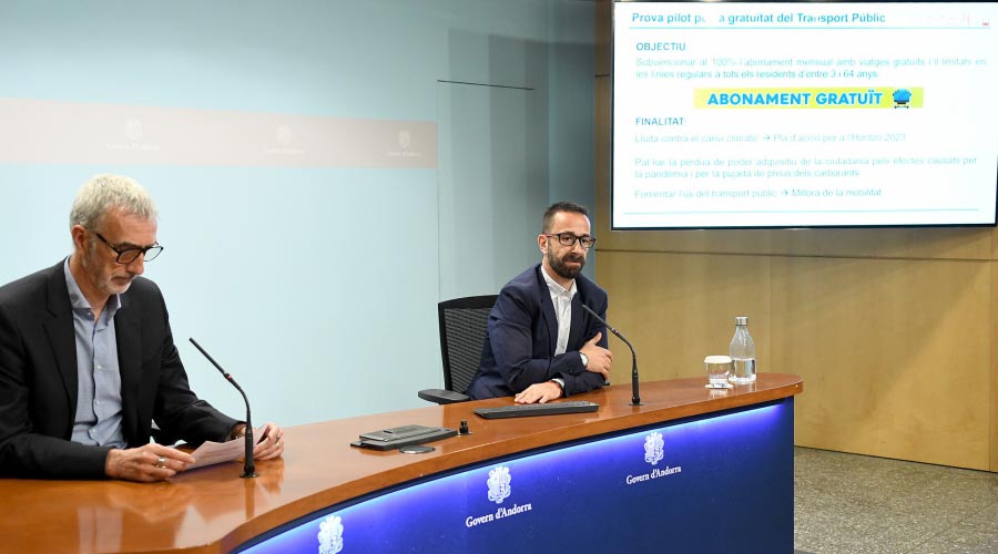 El secretari d’Estat d’Economia i Empresa, Èric Bartolomé, i el director d’Empresa, Comerç, Desenvolupament Industrial i Transport, Josep Pujol, han presentat aquest dimarts l’operativitat per obtenir l’abonament gratuït per a les línies de transport nacional regular de viatgers.