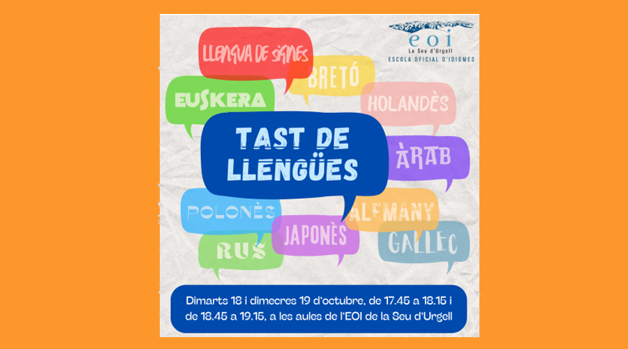 L’Escola Oficial d’Idiomes de la Seu d’Urgell organitza per sisena vegada el seu ‘Tast de Llengües’, amb què ofereix la possibilitat d’aprendre nocions bàsiques de diversos idiomes gràcies a la col·laboració d’habitants del Pirineu que els parlen.