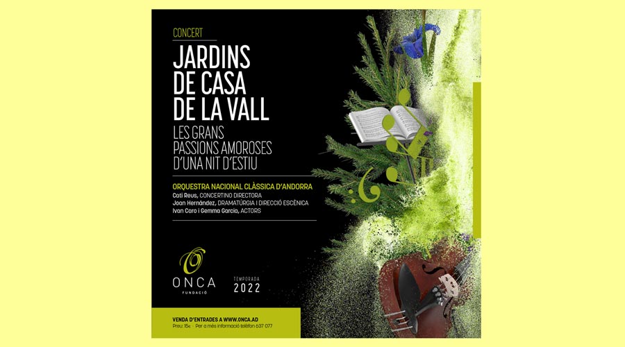 El dimecres 29 de juny, a les 22 hores, se celebrarà el tradicional Concert Jardins de Casa de la Vall, sota el títol Les grans passions amoroses d’una nit d’estiu. L’actuació anirà a càrrec de setze músics de la Fundació ONCA dirigits, per primera vegada, per la concertino directora, Cati Reus.