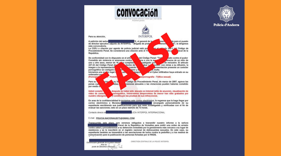 No és el primer cop que succeeix. És una pràctica que els estafadors utilitzen de tant en tant. Es tracta d’atemorir les possibles víctimes fent-se passar per la Policia Internacional. Així ho informa la Policia del Principat d’Andorra a través de les xarxes socials, a la vegada que demana d’estar alerta i desconfiar.
