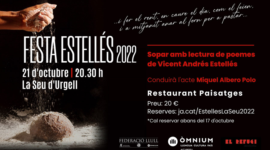 Òmnium Alt Urgell organitza per primera vegada el Sopar Estellés, una activitat amb la qual es vol homenatjar l’escriptor valencià Vicent Andrés Estellés tot recitant els seus poemes. L’acte tindrà lloc el divendres dia 21 d’octubre, a 2/4 de 9 del vespre, al restaurant Paisatges de la Seu d’Urgell.