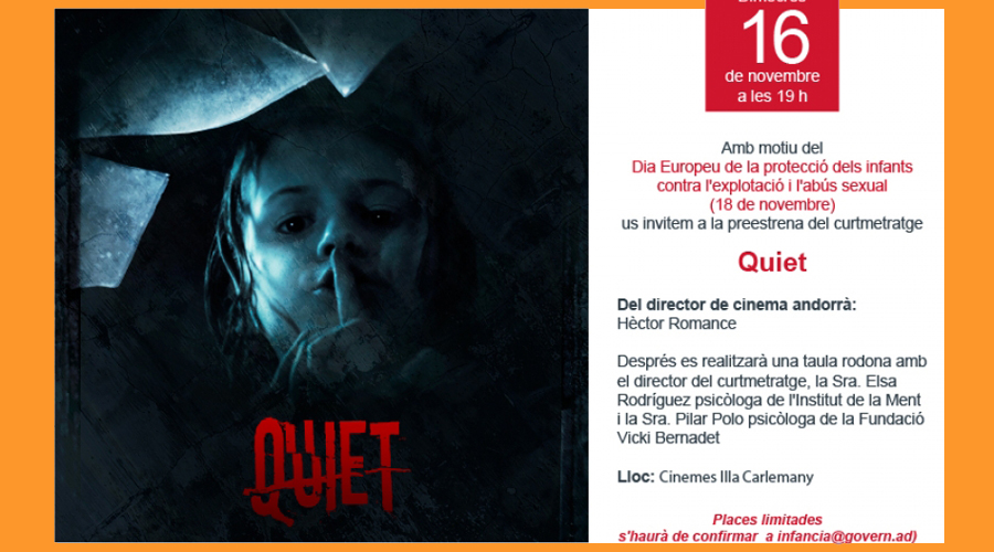Amb motiu del Dia Europeu de la protecció dels infants contra l’explotació i l’abús sexual, que se celebra el 18 de novembre, el Ministeri d’Afers Socials, Joventut i Igualtat organitza la preestrena del curtmetratge ‘Quiet’, del director Hèctor Romance, als Cinemes Illa Carlemany. L’acte tindrà lloc el dimecres, 16 de novembre, a les 19 hores.