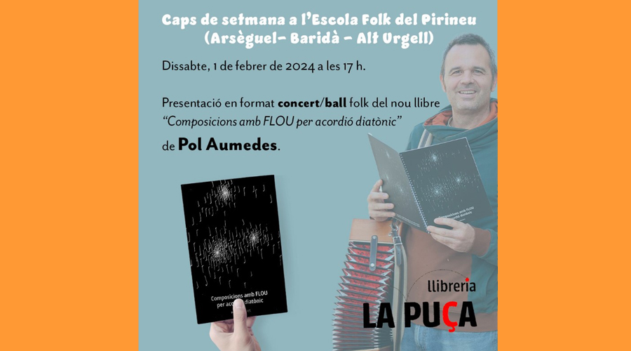 El músic Pol Aumedes presenta, aquest dissabte, a Arsèguel, a les 5 de la tarda, el seu nou llibre “Composicions amb FLOU per acordió diatònic”. L’obra es donarà a conèixer en format concert i ball a l’Escola Folk del Pirineu, amb la col·laboració de la Llibreria La Puça. La publicació és un recull de partitures de composició pròpia pensades especialment per a acordió diatònic amb molts dels gèneres musicals que sonen a plaça. Tenen una intenció didàctica i, per això, van acompanyades d’una notació específica per a una fàcil interpretació.