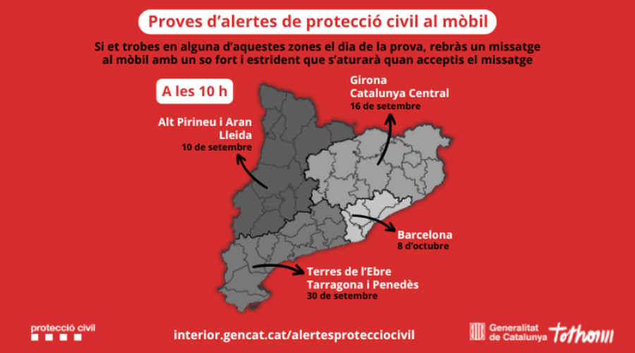 Protecció Civil de la Generalitat ha anunciat que realitzarà proves del sistema d’alertes de telèfons mòbils ES-ALERT a tot Catalunya durant els mesos de setembre i octubre. L’enviament d’avisos es comprovarà en quatre dies diferents i en diferents zones geogràfiques agrupades per vegueries. Així, aquest mateix dimecres, 10 de setembre, es validaran les alarmes a l’Alt Pirineu i Aran i a Lleida, mentre que el 16 de setembre es provarà el sistema a Girona i la Catalunya Central. Pel que fa a Tarragona, les Terres de l’Ebre i el Penedès, la data prevista és el 30 d’octubre, i a Barcelona, es farà la prova el 8 d’octubre.