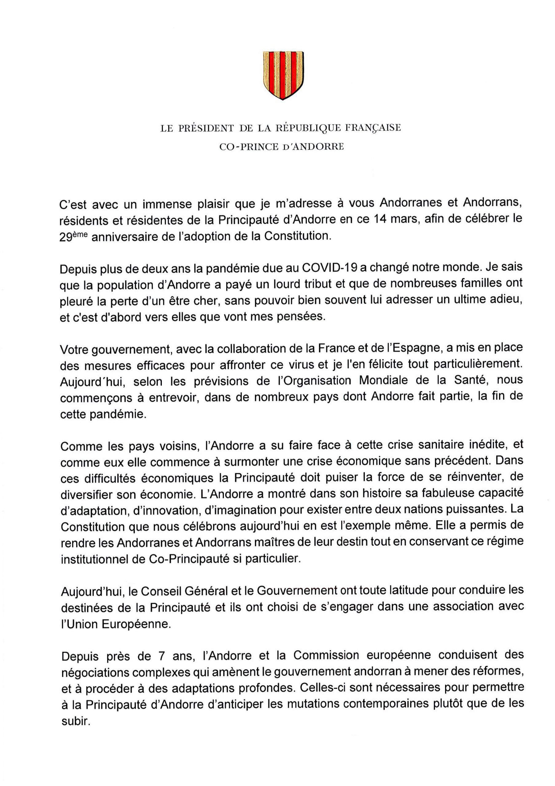 Com els països veïns, Andorra ha sabut fer front a aquesta inèdita crisi sanitària, i com ells comença a superar una crisi econòmica sense precedents. D’aquestes dificultats econòmiques el Principat ha de treure la força per reinventar-se, per diversificar la seva economia. Andorra ha demostrat en la seva història la seva fabulosa capacitat d’adaptació, innovació, imaginació per existir entre dues nacions poderoses. La Constitució que celebrem avui n’és el mateix exemple. Ha permès a les Andorranes i Andorrans ser amos del seu destí tot conservant aquest règim institucional de Coprincipat tan particular.