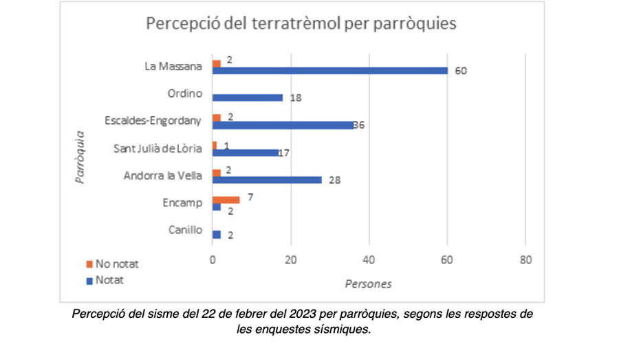 L’enquesta sísmica l’han respost 177 persones, el 94% de les quals ho ha fet el mateix dia del sisme. De totes les persones que han respost l’enquesta, el 92% afirma que va percebre el terratrèmol. La Massana és la parròquia amb més nombre de respostes i, per tant, amb més persones que han notat el terratrèmol.