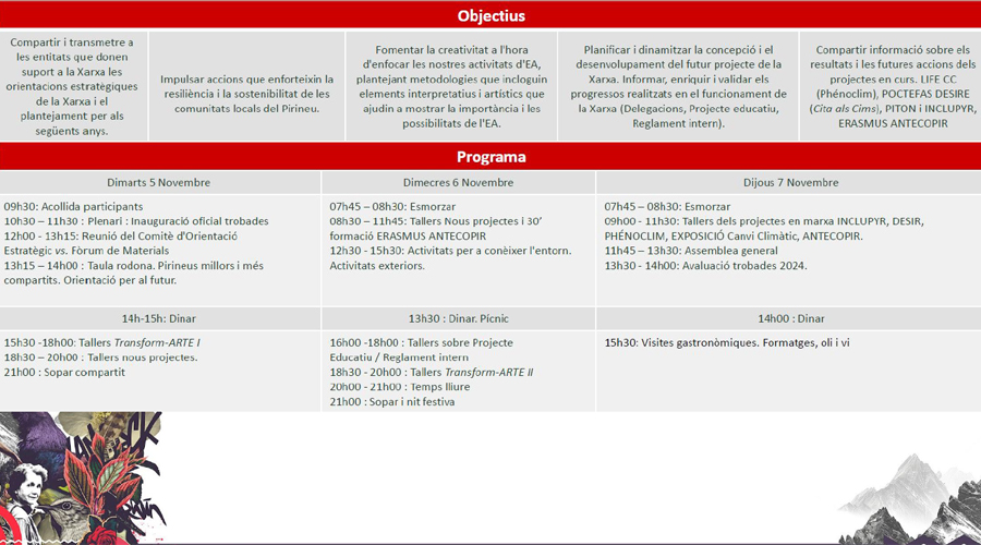 Des d’aquest dimarts dia 5 i fins al dijous 7 de novembre, se celebra a Alquèssar (Aragó), la trobada anual de la Xarxa Educació Pirineus Vius amb més de 80 entitats pirinenques d’educació ambiental i representants territorials de Catalunya, Navarra, Aragó, Occitània, Nova Aquitània i Andorra, que donen suport a aquesta iniciativa transfronterera. El tema central d’enguany és fomentar l’art i la creativitat artística dins de l’educació ambiental. Pel Principat hi ha la presència d’Andorra Recerca i Innovació (AR+I).