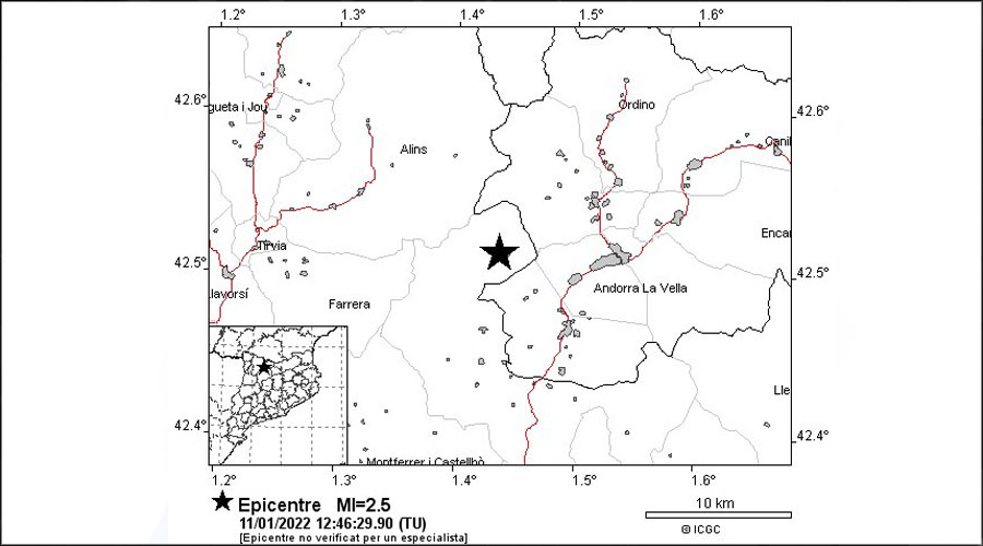 Com a mínim s’ha notat a Sant Julià de Lòria i a Andorra la Vella quan faltaven alguns minuts per a les dues de la tarda. Concretament, i segons ha informat Andorra Recerca i Innocació, el terratrèmol s’ha registrat a les 12:46h (temps universal), és a dir a les 13:46h (hora local).