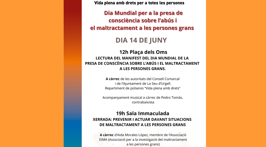 Coincidint amb el Dia Mundial per a la presa de consciència sobre l’abús i el maltractament a les persones grans, a la Seu d’Urgell, s’han organitzat dos actes per al proper dijous, 14 de juny. El primer consistirà en la lectura d’un manifest relacionat amb la temàtica que tindrà lloc a la plaça dels Oms, a les 12 hores. Anirà a càrrec d’autoritats municipals i comarcals. A més es repartiran polseres amb el lema “Vida plena amb drets” i hi haurà un acompanyament musical amb el contrabaixista, Pedro Tomàs.